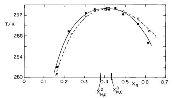 An apparent critical point in binary mixtures: Experimental and simulation study We report the experimental and simulation studies for the system of nitrobenzene-cyclododecane, showing an apparent critical point, which lies in their metastable, experimentally inaccessible state, below their melting point, affecting physical and chemical properties of this system in the stable liquid phase. The nonlinear dielectric effect NDE was measured in the mixture of nitrobenzene with cyclododecane. The mixture has been found to show an apparent critical point which lies below the melting point, manifested as anomalous NDE behavior in the vicinity of the critical concentrations in the stable liquid phase. Małgorzata Śliwińska-Bartkowiak, Błażej Ratajczak, Leszek Golibrocki, and Michał Banaszak THE JOURNAL OF CHEMICAL PHYSICS 124, 144516 2006