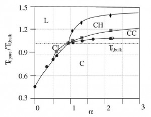 Global phase diagrams for freezing in porous media Using molecular simulations and free energy calculations based on Landau theory, we show that freezing/melting behavior of fluids of small molecules in pores of simple geometry can be understood in terms of two main parameters: the pore width H* (expressed as a multiple of the diameter of the fluid molecule) and a parameter that measures the ratio of the fluid-wall to the fluid–fluid attractive interaction. Ravi Radhakrishnan, Keith E. Gubbins, Małgorzata Śliwińska-Bartkowiak JOURNAL OF CHEMICAL PHYSICS, VOLUME 116, NUMBER 3, 15 JANUARY 2002