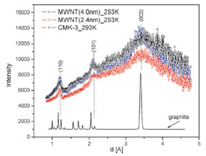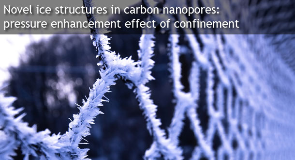 Novel ice structures in carbon nanopores: pressure enhancement effect of confinement We report experimental results on the structure and melting behavior of ice confined in multi-walled carbon nanotubes and ordered mesoporous carbon CMK-3, which is the carbon replica of a SBA-15 silica template. The silica template has cylindrical mesopores with micropores connecting the walls of neighboring mesopores. Monika Jazdzewska, Małgorzata M. Sliwinska-Bartkowiak, Anatoly I. Beskrovnyy, Sergey G. Vasilovskiy, Siu-Wa Ting, Kwong-Yu Chan, Liangliang Huang and Keith E. Gubbins Phys. Chem. Chem. Phys., 2011, 13, 9008–9013